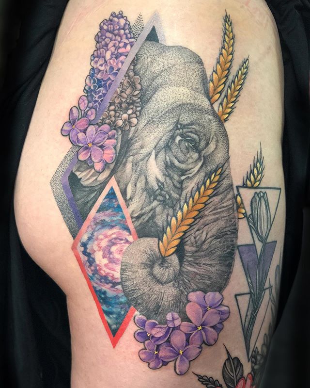 Colette’s artistry ranges from black and grey, geometric mandala dot work, featuring a lion, to the head of an elephant peeking through a colorful, prism, clutching a wheat stock in its curled trunk.