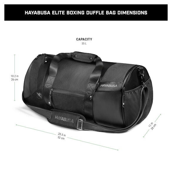The Hayabusa Elite Duffle Bag is engineered specifically for boxers with a custom-made pocket built to house your gloves. Its spacious main compartment makes storing all of your equipment easy, while the various pouches and pockets are ideal for your hand wraps, mouthguard, and valuables. The hard-wearing, water-resistant exterior features heavy-duty nylon straps, premium zipper pulls, and a removable padded shoulder strap. Turn heads everywhere you go with the perfect boxing gym bag that’s made to last a lifetime.
